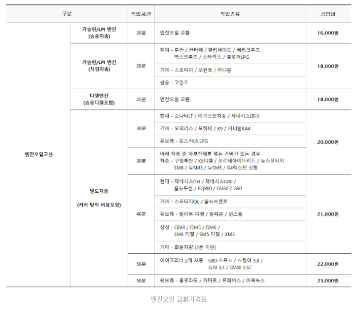 엔진오일 교환비용은 일반적으로 6만원에서 10만원까지로 다양합니다. 엔진오일, 오일필터, 에어클리너를 직접 구매해서 교체 작업만 맡길 수 있는 공임 나라를 기준으로 했을 때 국산 가솔린 차량의 엔진오일 교환 가격(공임비)는 1만 6천원~1만 8천원, 디젤 차량의 엔진오일 교환가격은 1만 8천원으로 안내되고 있고 수입차의 경우에는 2만 7천원으로 안내되어 있습니다.